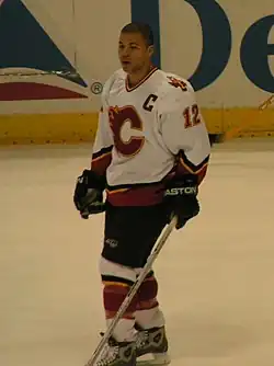 At the start of the 2003–04 season, Iginla was named the 18th captain in Flames franchise history, and 14th since the team moved to Calgary from Atlanta in 1980.[35] His predecessor as captain, Craig Conroy, cited Iginla's experience and leadership for his decision to relinquish the captaincy. "He was a leader on that team and old enough to where he'd been there a long time. It was time for him. He took us to the Stanley Cup Finals that year so it worked out pretty well."[36] Iginla was reported to be the first black captain in NHL history,[37] though former Blackhawks captain Dirk Graham, who is of African descent, has also been said to hold that honour.[38] Iginla responded to being named captain by capturing his second Rocket Richard Trophy, sharing the goal-scoring title with Ilya Kovalchuk and Rick Nash with 41 goals.[39] The Flames qualified for the 2004 playoffs as the sixth seed in the West, the team's first playoff appearance in eight years.[40] Iginla led all playoff scorers with 13 goals as he captained the Flames to their first Stanley Cup Finals appearance in 15 years. The Flames were unable to defeat the Tampa Bay Lightning, however, falling to the Eastern Conference champions in seven games after initially holding a 3–2 series lead. A dejected Iginla sat in the Flames locker room after game seven and was met by his father, who told his son that "I'm proud of you. All of Canada is proud of you."[41]