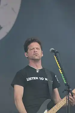 During a meeting between the members of Metallica in December 2000, Newsted proposed that the band should take a year-long hiatus, and he would use that time to focus on his side-project Echobrain. When the other band members (specifically James Hetfield) rejected Newsted's proposals, he chose to quit the band.[14][15] On January 17, 2001, as plans were being made for the band to enter the recording studio to record their eighth studio album, Newsted made his departure public, citing "private and personal reasons and the physical damage I have done to myself over the years while playing the music that I love."[16] During a Playboy interview with Metallica, Newsted revealed that he wanted to release an album with Echobrain. Hetfield was against the idea and said, "When someone does a side project, it takes away from the strength of Metallica." Newsted countered his statement by citing Hetfield's contributions to other musical outlets. Hetfield replied, "My name isn't on those records, and I'm not out trying to sell them", and pondered questions such as "Where would it end? Does he start touring with it? Does he sell shirts? Is it his band?"[17] Newsted's departure from Metallica, along with Hetfield's decision to go to rehab a few months later, almost led to a breakup of the band. After Hetfield rejoined Metallica, the band finished recording St. Anger, with record producer Bob Rock filling the bass slot. Robert Trujillo became the band's new bassist in 2003.