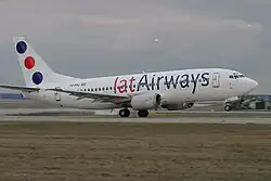 On 20 March 2003, the airline changed its name to Jat Airways.[29] A national competition was held to design the new logo and livery. The winning design had three dots on the tail: blue, red and blue. The fuselage of the aircraft had a large Jat Airways title, with Jat in red and Airways in blue. The new logo was the name Jat Airways written with three dots in blue, red and blue following it. Jat Airways painted only one aircraft in these colours, a Boeing 737-300.