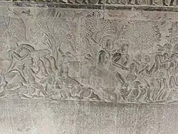 The Javan rhinoceros occurred in Cambodia in the past and at least three depictions of rhinos are in the bas reliefs of the temple at Angkor Wat. The west wing of the North Gallery has a relief that shows a rhino mounted by a god thought to be the fire god Agni. The rhinos are thought to be Javan rhinoceros rather than the somewhat similar-looking one-horned Indian rhino on the basis of the skinfold on the shoulder that continues along the back in the Javan to give a saddle-like appearance. A depiction of the rhino in the east wing of the South Gallery shows a rhino attacking the damned in the panel depicting heaven and hell. An architect of the temple is thought to have been an Indian Brahmin priest named Divakarapandita (1040–1120 AD) who served king Jayavarman VI, Dharanindravarman I, as well as Suryavarman II, who constructed the temple. The Indian priest who died before the construction of the temple is thought to have influenced the use of tubercles on the skin, which are based on the Indian rhino, while the local Khmer artisans carved the other details of the rhinos based on the more familiar local Javan rhino.[62] The association of the rhinoceros as the vahana of the god Agni is unique to Khmer culture.[63][64] Another rhinoceros carving in the middle of a circular arrangement in a column with other circles containing elephants and water buffalo is known from the temple of Ta Prohm. Based on anachronistic speculation, it might represent a stegosaur due to the leaves behind it that give the impression of plates.[65]