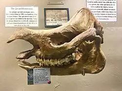 The oldest known definitive fossils of the Javan rhinoceros are from the Late Pliocene deposits of Myanmar, Java, and Pakistan.[18][19][20] Molecular estimates suggest the Indian and Javan rhinoceros diverged from each other earlier, around 4.3 million years ago.[17] An astragalus fossil similar to that of the Javan rhinoceros from the Late Miocene deposits of Myanmar have been identified as Rhinoceros cf. R. sondaicus.[21]