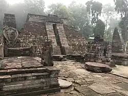 The cradle of Javanese culture is commonly described as being in Kedu and Kewu Plain in the fertile slopes of Mount Merapi as the heart of the Mataram kingdom.[39] The earliest Sanjaya and Sailendra dynasties had their power base there.[40]: 238–239 Between the late 8th century and the mid-9th century, the kingdom saw the blossoming of classical Javanese art and architecture reflected in the rapid growth of temple construction. The most notable of the temples constructed are Kalasan, Sewu, Borobudur and Prambanan.[41] The Java valley was home to thousands of Hindu temples that co-existed with Buddhist temples, most of which were buried in the massive eruption of Mount Merapi in 1006 AD.[42] At its peak, the Javanese kingdom had become a dominant empire that exercised its power—not only in Java island, but also in Sumatra, Bali, southern Thailand, Indianized kingdoms of the Philippines, and the Khmer in Cambodia.[43][44][45] Jayavarman II, a prince who had lived at the Sailendra court in Java, brought Javanese art and culture, including the concept of the devaraja, to Cambodia, laying the foundations for Khmer civilization.[46][47]