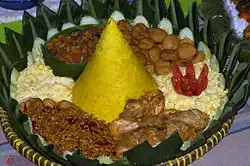 Tumpeng, is a rice served in the shape of a conical volcano,[79] usually with rice coloured yellow using turmeric. It is an important part of many ceremonies in Java. Tumpeng is served at landmark events such as birthdays, moving house, or other ceremonies.[80] Traditionally, Tumpeng is served alongside fried chicken, boiled egg, vegetables, and goat meat on a round plate made from bamboo called besek.