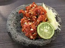 Pecel, a type of peanut sauce with chili[77] is a common ingredient in Javanese cuisine. It is used in various types of Rujak and Gado-gado. It can also be used as stand-alone sauce with rice, prawns, eggs and vegetables as Nasi Pecel (Pecel rice).[78]
