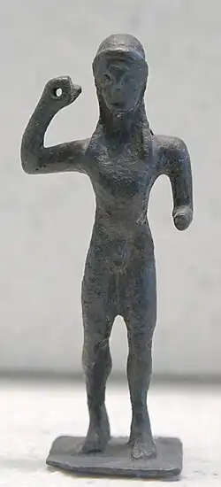 A strap or tasseled head was situated at the lower end of the javelin: it allowed the javelin thrower to recover his javelin after throwing it.[5]