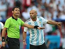 In May 2018, Mascherano was named in Jorge Sampaoli's final 23-man squad for the 2018 FIFA World Cup in Russia.[91] He earned his 143rd cap in a 4–0 friendly win against Haiti on 29 May 2018, equaling Javier Zanetti's record for the most appearances for Argentina.[92] His 144th cap came in Argentina's opening match at the World Cup, a 1–1 draw against Iceland on 16 June 2018, thus becoming the sole most capped player in the country's history.[93]