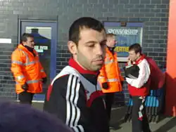 In his first game at Old Trafford against Manchester United on 23 March 2008, Mascherano was sent off after collecting two yellow cards.[42] He was initially booked for a late tackle on Paul Scholes, and later dismissed for running towards referee Steve Bennett to protest a yellow card shown to Fernando Torres. Mascherano had to be pushed from the field of play by Steven Gerrard and Xabi Alonso. Rafael Benítez was forced to leave the dugout and plead with Mascherano to leave the field, and he was escorted down the tunnel by Peter Crouch. The Football Association ruled that the usual one-game suspension be increased to three games for improper conduct.[43] Mascherano admitted the improper conduct charge levelled at him, but appealed the further two-to-three-match suspension.[44] This appeal was denied by the FA, however,[45] and Mascherano was also fined £15,000; he demanded that this fine would be paid to a charity.[46]