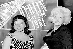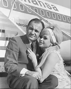 Jayne Mansfield met her second husband, Mickey Hargitay, at the Latin Quarter nightclub in New York City on May 13, 1956, where he was performing as a member of the chorus line in Mae West's show.[56] Hargitay was an actor and bodybuilder who won the Mr. Universe competition in 1955.[184] Mansfield fell for him immediately, which resulted in a squabble with West.[185][186]