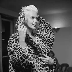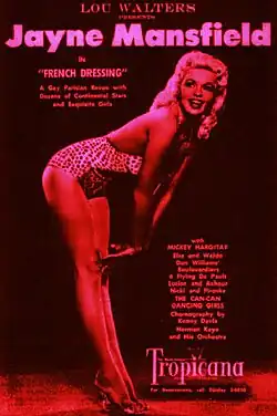 In February 1958, the Tropicana Las Vegas launched Mansfield's striptease revue The Tropicana Holiday (produced by Monte Proser and co-starring Mansfield's then-husband, Mickey Hargitay) under a four-week contract that was extended to eight.[116][117] The opening night raised $20,000 for March of Dimes She received $25,000 per week for her performance as Trixie Divoon in the show, while her contract with 20th Century Fox was paying her $2,500 per week.[118][119][120] She had a million-dollar policy with Lloyd's of London in case Hargitay dropped her as he whirled her around for the show.[121][122] In 1959, Jayne returned to the Tropicana with her show being extended from a four-week run to eight when Betty Hutton's engagement there failed to materialize.[123] In December 1960, the Dunes hotel and casino launched Mansfield's revue The House of Love (produced by Jack Cole, co-starring Hargitay). She received a salary of $35,000 a week, the highest of her career.[124][125]
