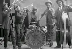 The Original Dixieland Jass Band made the music's first recordings early in 1917, and their "Livery Stable Blues" became the earliest released jazz record.[108][109] That year, numerous other bands made recordings featuring "jazz" in the title or band name, but most were ragtime or novelty records rather than jazz. In February 1918 during World War I, James Reese Europe's "Hellfighters" infantry band took ragtime to Europe,[110][111] then on their return recorded Dixieland standards including "Darktown Strutters' Ball".[81]