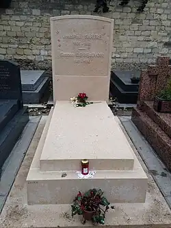 Sartre died on 15 April 1980 in Paris from pulmonary edema. He had not wanted to be buried at Père-Lachaise Cemetery between his mother and stepfather, so it was arranged that he be buried at Montparnasse Cemetery. At his funeral on Saturday, 19 April, 50,000 Parisians descended onto boulevard du Montparnasse to accompany Sartre's cortege.[94][95] The funeral started at "the hospital at 2:00 p.m., then filed through the fourteenth arrondissement, past all Sartre's haunts, and entered the cemetery through the gate on the Boulevard Edgar Quinet". Sartre was initially buried in a temporary grave to the left of the cemetery gate.[96] Four days later the body was disinterred for cremation at Père-Lachaise Cemetery, and his ashes were reburied at the permanent site in Montparnasse Cemetery, to the right of the cemetery gate.[97]