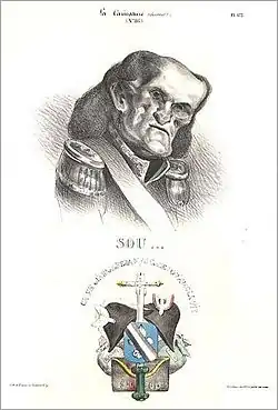 1. ^ Although many sources give Soult's first name as Nicolas, that does not appear on his birth certificate: "Soult's first name is NOT Nicolas", from Soult, Maréchal d'Empire et homme d'État by Nicole Gotteri (édition de la Manufacture). See page 20: "It is therefore perfectly clear that Marshal Soult's first name was Jean de Dieu. The undue addition of 'Nicolas' is only the result of the slander unleashed following the Portuguese campaign [...]". Kaga- (d) 29 December 2011 at 13:26 (CET). "This name [Nicolas] was given to him by his enemies, who accused him of wanting to be crowned King of Spain, since at that time this name meant 'falsifier', 'boaster'" (as per: Les monuments de l'Empire - L'Empire… par ses Monuments, Jean de Dieu Soult (1769-1804-1851), napoleon-monuments.eu).