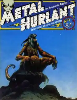 Later that year, after Dune was permanently canceled with him definitively returning to France, Giraud became one of the founding members of the comics art group and publishing house "Les Humanoïdes Associés", together with fellow comic artists Jean-Pierre Dionnet, Philippe Druillet (likewise Pilote colleagues) and (outsider) financial director Bernard Farkas. In imitation of the example set by the L'Écho des savanes founding editors, it was therefore as such also an indirect result of the revolt these artists had previously staged at Pilote, and whose employ they had left for the undertaking.[74] Together they started the monthly magazine Métal hurlant ("Screaming metal") in December 1974,[75] and for which he had temporarily abandoned his Blueberry series. The translated version was known in the English-speaking world as Heavy Metal, and started its release in April 1977, actually introducing Giraud's work to North-American readership.[76] Mœbius' famous serial "The Airtight Garage" and his groundbreaking "Arzach" both began in Métal hurlant.[77] Unlike Hara-Kiri and L'Écho des savanes though, whose appeal has always remained somewhat limited to the socially engaged satire and underground comic scenes, it was Métal hurlant in particular that revolutionized the world of Franco-Belgian bandes dessinées,[50] whereas its American cousin left an indelible impression on a generation of not only American comic artists, but on film makers as well, as evidenced below.