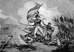 Lannes served under General Barthélemy Louis Joseph Schérer, taking part in the Battle of Loano.[5] However, in 1795, as a result of the reforms of the army introduced by the Thermidorians, he was dismissed from his rank.[6] He re-enlisted as a simple volunteer in the French Armée d'Italie. He served in the Italian campaign of 1796, and climbed his way up to high rank once again, being given command of a brigade in General Charles-Pierre Augereau's division[7] and later of 3 battalions of the permanent advance guard at different times.[8] Lannes was distinguished in every battle and played an important role in the victory at Dego.[8] At the Battle of Bassano, he captured two enemy flags with his own hands[8] and received multiple wounds at the Battle of Arcole but kept leading his column in person.[9]