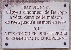 - commemorative plaques on the Willard Hotel in Washington DC, where he worked during World War II; the building at 18, rue de Martignac, where he created France's General Planning Commission; the Hotel Grand Chef at Mondorf-les-Bains in Luxembourg, where he lived in 1952-1953; the house at 138, rue des Muguets in Luxembourg, where he lived in 1953-1955; the building on 83, avenue Foch in Paris, where his Action Committee for the United States of Europe had its office from 1955 to 1975; and the house at Houjarray where he lived after 1945 and died in 1979.