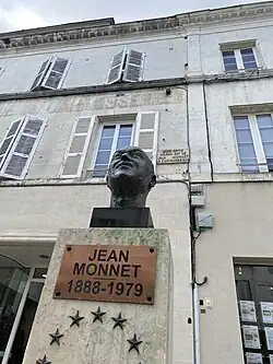 - bronze busts in front of his birthplace in Cognac; at the entrance of the square Jean-Monnet in Montpellier; in Angers;[50] inside the Peace Palace in The Hague; and as part of the Monument to the Founding Fathers of the European Union in King Michael I Park, Bucharest.[51]