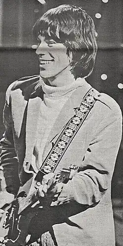 In March 1965, Beck was recruited by the Yardbirds to succeed Eric Clapton on the recommendation of fellow session musician Jimmy Page, who had been their initial choice.[31] The Yardbirds recorded most of their Top 40 hit songs during Beck's short but significant 20-month tenure with the band allowing him only one full album, which became known as Roger the Engineer (titled Over Under Sideways Down in the U.S.), released in 1966. In May 1966, Beck recorded an instrumental titled "Beck's Bolero". Rather than members of the Yardbirds, he was backed by Page on 12-string rhythm guitar, Keith Moon on drums, John Paul Jones on bass, and Nicky Hopkins on piano. In June, Page joined the Yardbirds, at first on bass and later on second lead guitar.[31] This dual lead-guitar lineup was filmed performing an adaptation of "Train Kept A-Rollin'", titled "Stroll On", for the 1966 Michelangelo Antonioni film Blowup.[32]