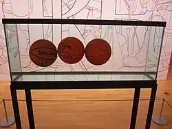 Another example for Koons's early work is The Equilibrium Series (1983), consisting of one to three basketballs floating in distilled water, a project the artist had researched with the help of Nobel Prize-winning physicist Richard Feynman.[7] The Total Equilibrium Tanks are completely filled with distilled water and a small amount of ordinary salt, to assist the hollow balls in remaining suspended in the centre of the liquid. In a second version, the 50/50 Tanks, only half the tank is filled with distilled water, with the result that the balls float half in and half out of the water.[30] In addition, Koons conceived and fabricated five unique works for the Encased series (1983–1993/98), sculptures consisting of stacked sporting balls (four rows of six basketballs each, and one row of six soccer balls) with their original cardboard packaging in glass display case.[31] Also part of the Equilibrium series are posters featuring basketball stars in Nike advertisements and 10 bronze objects, representing lifesaving gear.