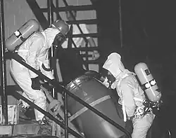 Inside his apartment and in an effort to verify his claim that he and Sinthasomphone were lovers, Dahmer showed the officers the two semi-nude Polaroid pictures he had taken of Sinthasomphone the previous evening. Though Balcerzak said he smelled nothing unusual, Gabrish later stated he noted a strange scent reminiscent of excrement inside the apartment.[204] This odor emanated from the decomposing body of Hughes.[205][206] Dahmer stated that to investigate this odor, one officer simply "peeked his head around the bedroom, but really didn't take a good look".[198][n 14] The officers then left, with a departing remark that Dahmer "take good care" of Sinthasomphone.[208] This incident was listed by the officers as a "domestic dispute".[198][n 15]