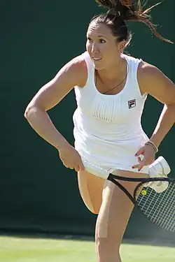 On grass, Janković captured the Birmingham Classic title, beating top-seeded Maria Sharapova in the final. Sharapova led 3–0 in the third set, before Janković rallied to win the match.[21] The next week, Janković reached the final of the Ordina Open in the Netherlands and became the first player since Chris Evert in 1974 to win 50 matches in the first half of a year.[22] Janković, suffering from a hamstring injury, lost the final to Anna Chakvetadze. At Wimbledon, Janković was the third seed, but lost in the fourth round to the surprise eventual finalist Marion Bartoli. In the mixed doubles competition at Wimbledon, Janković teamed with doubles specialist Jamie Murray to win the title in three sets by beating the fifth-seeded team, Jonas Björkman and Alicia Molik.[11][23]