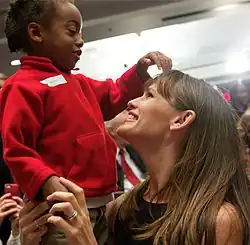 In 2011, Garner partnered with Frigidaire as part of her work with Save the Children.[136] In 2013, Garner took her eldest daughter Violet to a Save the Children gala in New York: "My husband and I have never taken our kids to a public event before, but I brought my daughter Violet, because ... I want her to see the passionate commitment Mark Shriver and Hillary Clinton have to make the world a better place for everyone."[137] In 2014, she joined the Invest in Us campaign.[132] In 2015, she appeared in A Path Appears, a PBS documentary that focuses on rural poverty among children in West Virginia.[138]