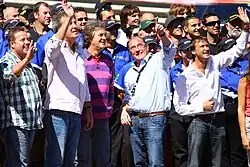 Clarkson (second from left) at the 2011 Top Gear Live show, along with James May (third from left) and Shane Jacobson (far left)