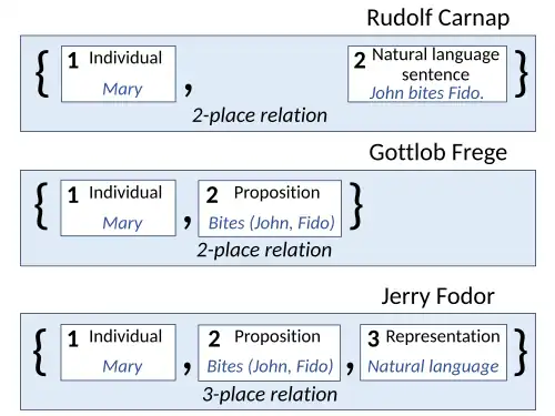 Despite the changes in many of his positions over the years, Fodor's idea that mental states embodying intentionality, propositional attitudes,[11] like beliefs and desires are relational never changed.[12][13] He attempted to show how mental representations, specifically sentences in the language of thought, are necessary to explain this relational nature of mental states. Fodor considers two alternative hypotheses. The first denies the relational character of mental states, while the second considers mental states as two-place relations.[12] The latter position can be further subdivided into the Carnapian view that such relations are between individuals and sentences of natural languages,[14][15][16] and the Fregean view that they are between individuals and the propositions expressed by such sentences.[17] Fodor's own position, instead, is that to properly account for the nature of intentional attitudes, it is necessary to employ a three-place relation between individuals, representations and propositional contents.[18][13]