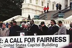 In 1998, Clinton's affair with White House intern Monica Lewinsky became public, and his lying under oath about the affair led to an impeachment inquiry by the House.[218] In an interview with The Washington Post, Jackson explained his opposition to Clinton's removal from office: "The punishment of impeachment does not correspond to the nature of Mr. Clinton's lack of candor. What he did does not fit the definition of high crimes; it was a little crime."[219] On December 17, Jackson led a prayer vigil outside the U.S. Capitol for the purpose of increasing the visibility of those opposed to Clinton's impeachment.[220] The House impeached Clinton the next day.[221][222]