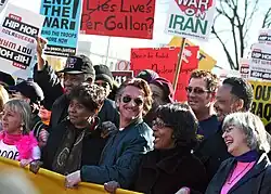 His international efforts continued into the 2000s. On February 15, 2003, Jackson spoke in front of over an estimated one million people in Hyde Park, London at the culmination of the anti-war demonstration against the imminent invasion of Iraq by the U.S. and the United Kingdom.[42] In November 2004 Jackson visited senior politicians and community activists in Northern Ireland in an effort to encourage better cross-community relations and rebuild the peace process and restore the governmental institutions of the Belfast Agreement.[43]