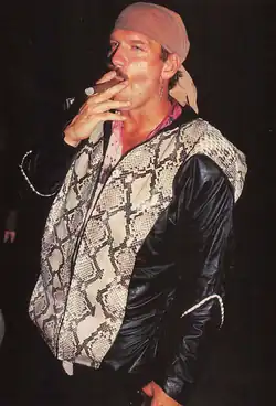 Ventura created the stage name Jesse "The Body" Ventura to go with the persona of a bully-ish beach bodybuilder, picking the name "Ventura" from a map as part of his "bleach blond from California" gimmick.[1] As a wrestler, Ventura performed as a heel. He resurrected Gorgeous George's old motto of "Win if you can, lose if you must, but always cheat!", which he emblazoned on his t-shirts. Much of this flamboyant persona was adapted from "Superstar" Billy Graham, a charismatic and popular performer during the 1970s.[1][45]
