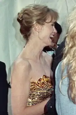 Lange continued making films throughout the 1990s, periodically taking time off to raise her children and do theater- and television-based projects. She began the decade in Paul Brickman's warmly received Men Don't Leave (1990), for which she earned positive reviews and came in third place for the National Society of Film Critics Award for Best Actress.[39] She was then approached by Martin Scorsese and Robert De Niro, who had both auditioned her for the role of Jake LaMotta's wife in Raging Bull (1980), to star in a remake of Cape Fear (1991). The film was the year's 12th- highest-grossing film. In 1992, Lange once again starred opposite De Niro in Irwin Winkler's Night and the City, and in a television adaptation of Willa Cather's O Pioneers!, receiving her seventh Golden Globe nomination for Best Actress. Lange made her Broadway debut, which met mixed reviews portraying Blanche DuBois in a production of Tennessee Williams's A Streetcar Named Desire opposite Alec Baldwin. Critics rebuked her performance, with the Boston Globe stating "Jessica Lange is learning a new craft—theatre—at Blanche’s expense, and ours."[40]