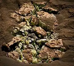 Native sulfur on Mars Discovered May 30, 2024, when the Curiosity rover drove over this outcrop and cracked it open.