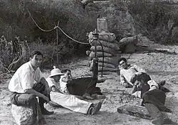 The "Suicide Squad" of (left to right) Rudolph Schott, Apollo Milton Olin Smith, Frank Malina, Ed Forman and Jack Parsons testing their first liquid-fueled rocket engine.[5]