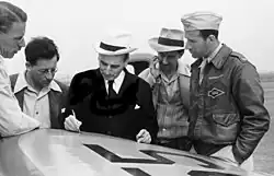 Theodore von Kármán sketching out a plan on the wing of an airplane. From left to right: Clark B. Millikan, Martin Summerfield, von Kármán, Frank J. Malina and pilot, Capt. Homer Boushey.
