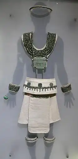 - 1 necklace with rounded lapis lazuli beads including: 28 rounded lapis lazuli beads, [and] 29 fluted beads for its clasp.[36]