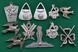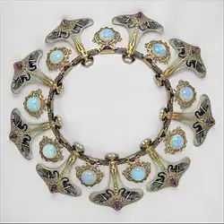 Many items of jewellery, such as brooches and buckles, originated as purely functional items, but evolved into decorative items as their functional requirement diminished.[8] Similarly, Tiffany & Co. produced inkwells in the late 19th and early 20th centuries, skillfully combining materials like enamel and fine metals, reflecting the same craftsmanship seen in their jewellery collections. These inkwells were not only practical but also artistic in design.[9][10]