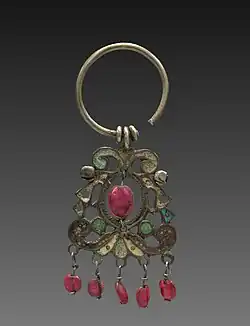 Egyptian designs were most common in Phoenician jewellery. Also, ancient Turkish designs found in Persian jewellery suggest that trade between the Middle East and Europe was not uncommon. Women wore elaborate gold and silver pieces that were used in ceremonies.[29]