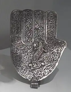 Another major type is the so-called khmissa (local pronunciation of the Arabic word "khamsa" for the number "five"), which is called afus in the Berber language (Tamazight). This form represents the five fingers of the hand and is traditionally believed both by Muslims as well as Jewish people to protect against the evil eye.[30]