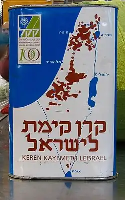 The idea of a national land purchasing fund was first presented at the First Zionist Congress in 1897 by Hermann Schapira, a Lithuanian-Jewish professor of mathematics.[19] The fund, named Keren Hakayemet (later known in English as the "Jewish National Fund") was formally established at the fifth World Zionist Congress in Basel in 1901.[20][21] In its early years, the organization was headed by the Jewish industrialist Johann Kremenezky.[22] Early land purchases were completed in Judea and the Lower Galilee. In 1909, the JNF played a central role in the founding of Tel Aviv. The establishment of the "Olive Tree Fund" marked the beginning of diaspora support of afforestation efforts. The JNF collection box or "blue box" (known in Yiddish as a pushke) has been part of the JNF since its inception, symbolizing the partnership between Israel and the diaspora. In the period between the two world wars, about one million of these blue and white tin collection boxes could be found in Jewish homes throughout the world.[23] From 1902 until the late 1940s, the JNF sold JNF stamps to raise money. For a brief period in May 1948, JNF stamps were used as postage stamps during the transition from Palestine to Israel.[24]