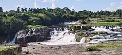 Jharkhand (Hindi: Jhārkhaṇḍ, pronounced [d͡ʒʱaːɾkʰəɳɖ] ⓘ; lit. 'the land of forests') is a landlocked state in eastern India.[15] The state shares borders with the states of West Bengal to the east, Chhattisgarh to the west, Uttar Pradesh to the northwest, Bihar to the north and Odisha to the south. It is the 15th largest state by area, and the 14th largest by population. Hindi is the official language of the state.[5] The city of Ranchi is its capital, and Dumka its sub-capital. The state is known for its waterfalls, hills and holy places; Baidyanath Dham, Parasnath, Dewri and Rajrappa are major religious sites.[16][17] As per 2011 census, Jharkhand is primarily rural, with about 24% of its population living in cities.[18]