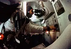 The task of supervising the Next Nine's training fell to Mercury Seven astronaut Gus Grissom.[36] Initially, each of the astronauts was given four months of classroom instruction on subjects such as spacecraft propulsion, orbital mechanics, astronomy, computing, and space medicine. Classes were for six hours a day, two days a week, and all sixteen astronauts had to attend. There was also familiarization with the Gemini spacecraft, Titan II and Atlas boosters, and the Agena target vehicle.[40] Jungle survival training was conducted at the United States Air Force (USAF) Tropic Survival School at Albrook Air Force Station in the Panama Canal Zone, desert survival training at Stead Air Force Base in Nevada, and water survival training on the Dilbert Dunker at the USN school at Naval Air Station Pensacola and on Galveston Bay.[41] Following the precedent set by the Mercury Seven, each of the Next Nine was assigned a special area in which to develop expertise that could be shared with the others, and to provide astronaut input to designers and engineers.[36] Lovell became responsible for recovery systems.[42]