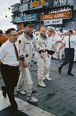Gemini 12 returned to Earth on November 15, after 59 orbits. During re-entry a pouch containing books and small pieces of equipment broke free and landed in Lovell's lap. He did not want to grab it, as he feared he might pull on the D-ring that activated the ejector seat. It did not move any further, and the landing went well. The spacecraft landed 5.6 kilometers (3 nmi; 3.5 mi) from the recovery ship, the aircraft carrier USS Wasp. Twelve experiments had been carried out.[65] This mission proved that people could work effectively outside the spacecraft, which was required for the Apollo missions with the goal of getting man on the Moon by the end of the decade.[66]