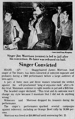 During a concert on March 1, 1969, at the Dinner Key Auditorium in Miami, a visibly intoxicated Morrison attempted to spark a riot in the audience, in part by screaming, "You wanna see my cock?" and other obscenities.[74] Three days later, six warrants for his arrest were issued by the Dade County Public Safety Department for indecent exposure, among other accusations.[75][76] Consequently, many of the Doors' scheduled concerts were canceled.[77][78] On September 20, 1970, Morrison was convicted of indecent exposure and profanity by a six-person jury in Miami after a sixteen-day trial.[79] Morrison, who attended the October 30 sentencing "in a wool jacket adorned with Indian designs", silently listened as he was sentenced to six months in prison and had to pay a $500 fine. However, Morrison remained free on a $50,000 bond while the verdict was being appealed.[80] At the sentencing, Judge Murray Goodman told Morrison that he was a "person graced with a talent" admired by many of his peers.[80]