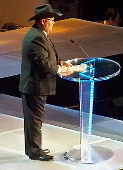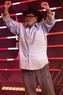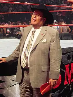 James William Ross (born January 3, 1952)[3] is an American professional wrestling commentator, sports announcer, and podcaster. He is signed with All Elite Wrestling (AEW), where he serves as a commentator as well as an analyst and senior advisor.[4] Ross is best known for a long and distinguished career as a play-by-play commentator for WWE. Known affectionately by WWE fans as "Good Ol' JR", Ross has been labeled as the greatest wrestling commentator of all time.[5] Ross, while in WWE, was occasionally involved in storylines and also participated in nine wrestling matches from 1999 to 2011.[6]
