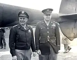 In July 1942, as a brigadier general—he had been promoted by two grades on the day after the Tokyo attack, bypassing the rank of full colonel—Doolittle was assigned to the nascent Eighth Air Force. This followed his rejection by General Douglas MacArthur as commander of the South West Pacific Area to replace Major General George Brett. Major General Frank Andrews first turned down the position and offered a choice between George Kenney and Doolittle, MacArthur chose Kenney.[27] In September, Doolittle became commanding general of the Twelfth Air Force, soon to be operating in North Africa. He was promoted to major general in November 1942, and in March 1943 became commanding general of the Northwest African Strategic Air Force, a unified command of U.S. Army Air Force and Royal Air Force units. In September, he commanded a raid against the Italian town of Battipaglia that was so thorough in its destruction that General Carl Andrew Spaatz sent him a joking message: "You're slipping Jimmy. There's one crabapple tree and one stable still standing."[28]