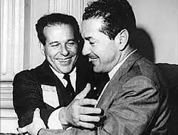 At the inauguration, Kubitschek, after receiving the banner and greeting the people, ordered the gates to be opened.[88] Goulart and Kubitschek had a similar tact in contact with the humble people,[88] but at first Kubitschek, jealous of Goulart's election result, tried to isolate him politically.[89] but he went back, and as Hugo de Faria said, Goulart didn't want to run for president.[89] Goulart did not allow anyone to disrespectfully speak of Kubitschek.[89]