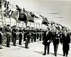 Economically Goulart was in favor of avoiding US dependence on foreign trade.[98] Within the PTB, several members were expelled due to their criticism.[99] Due to functional precariousness, subordinates in the Armed Forces began to approach the trade unions.[100] Despite the conservative officiality,[100] there were nationalist officers and in 1956, the sergeants achieved their stability.[101] Despite being in power, the PTB acted as the opposition, voicing open criticism of the government.[102]
