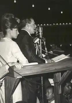 Due to the impossibility of assuming the position as a bachelor, Goulart had to get married. However, Maria Thereza, then 17, felt insecure and took a while to accept the idea, which was already arranged.[75] The civil ceremony took place on 14 May 1955, but it was by proxy, as a storm prevented Goulart's plane from arriving.[76] Four days later the religious wedding took place, followed by a short honeymoon due to the campaign.[77]