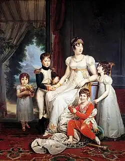 Murat married Caroline Bonaparte, with whom he shared the same birthday, in a civil ceremony on 20 January 1800 at Mortefontaine and in a religious ceremony on 4 January 1802 in Paris, thus becoming a son-in-law of Letizia Ramolino as well as brother-in-law to Napoleon Bonaparte, Joseph Bonaparte, Lucien Bonaparte, Elisa Bonaparte, Louis Bonaparte, Pauline Bonaparte and Jérôme Bonaparte.[18]