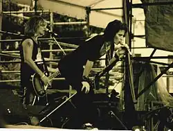 Jett released Album (1983) and Glorious Results of a Misspent Youth (1984). A string of Top 40 hits followed, as well as sellout tours with the Police, Queen, and Aerosmith, among others. She was among the first English-speaking rock acts to appear in Panama and the Dominican Republic.[26] According to Jett and Laguna, a riot occurred during their visit to Panama and Manuel Noriega requested Jett spend the night with him at the Presidential Palace.[27][28]